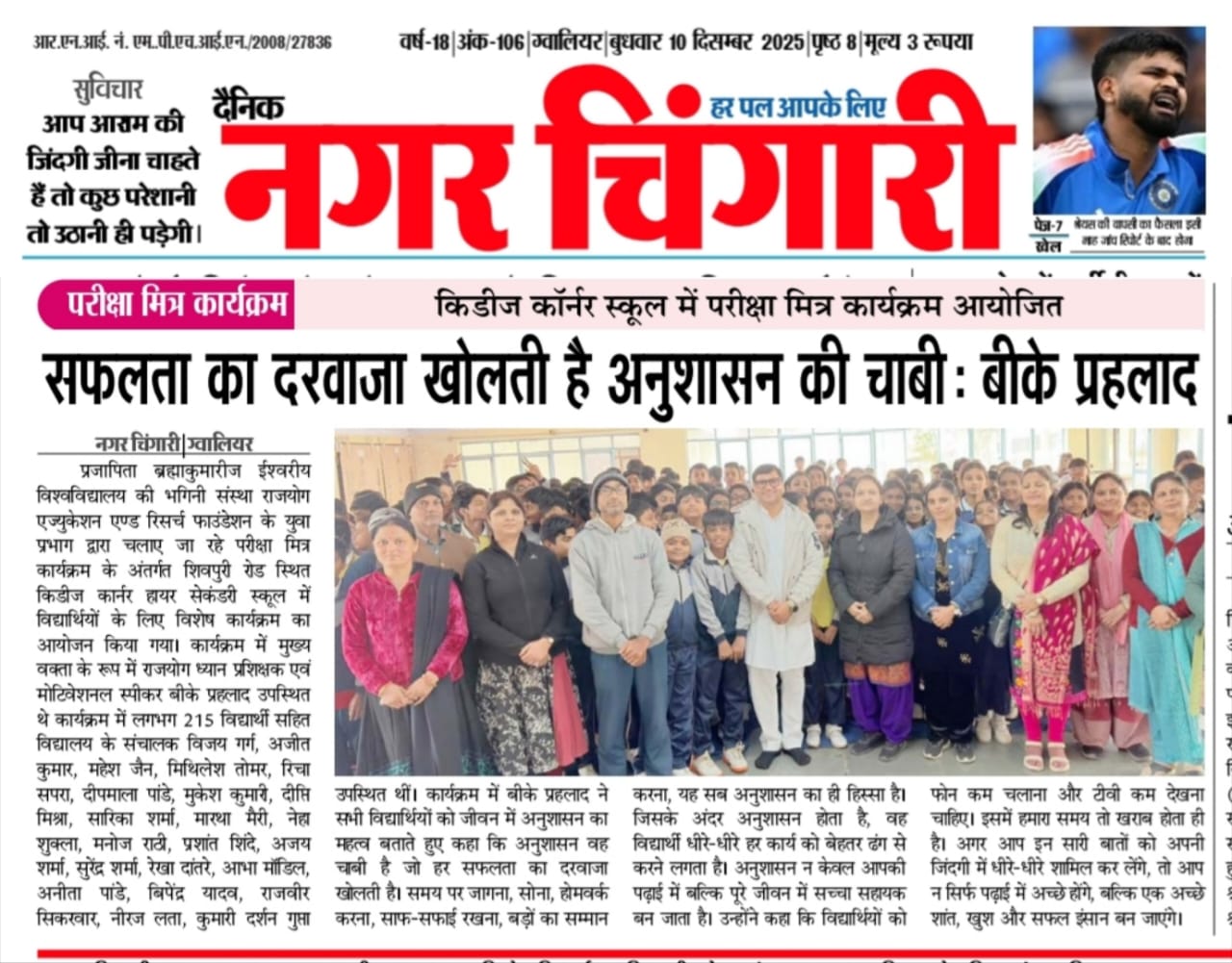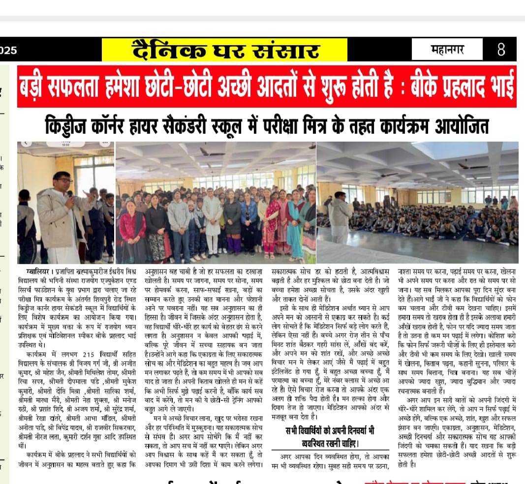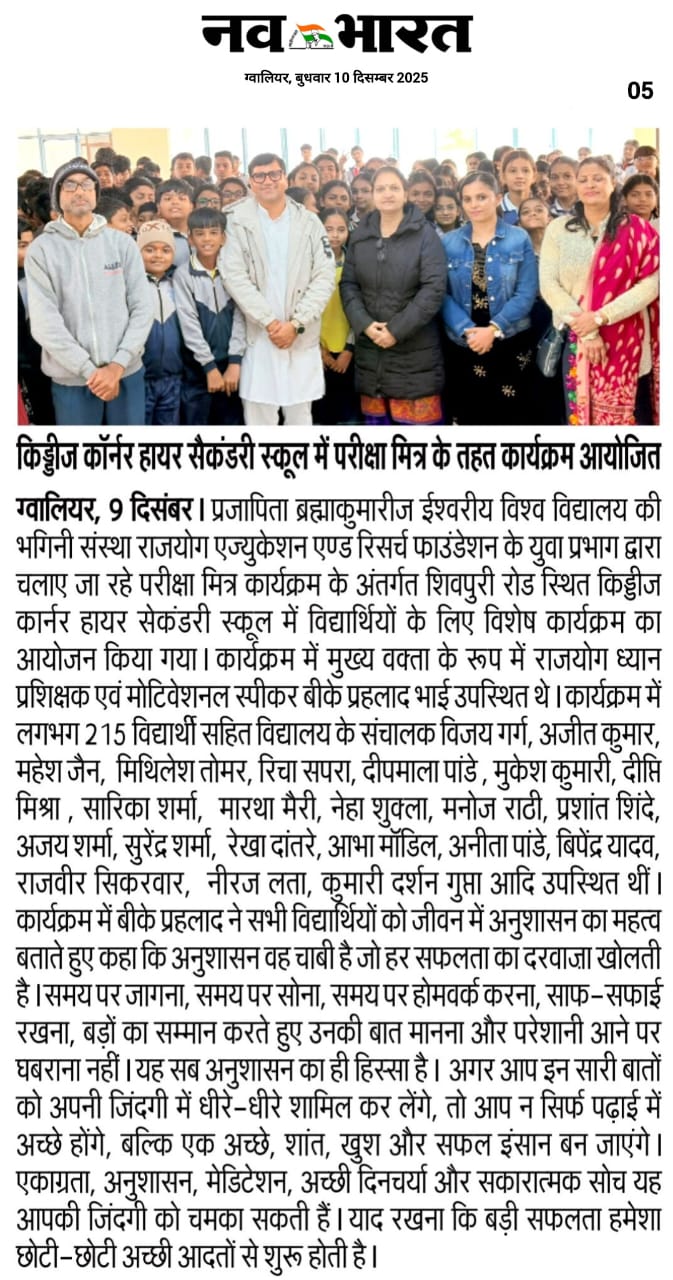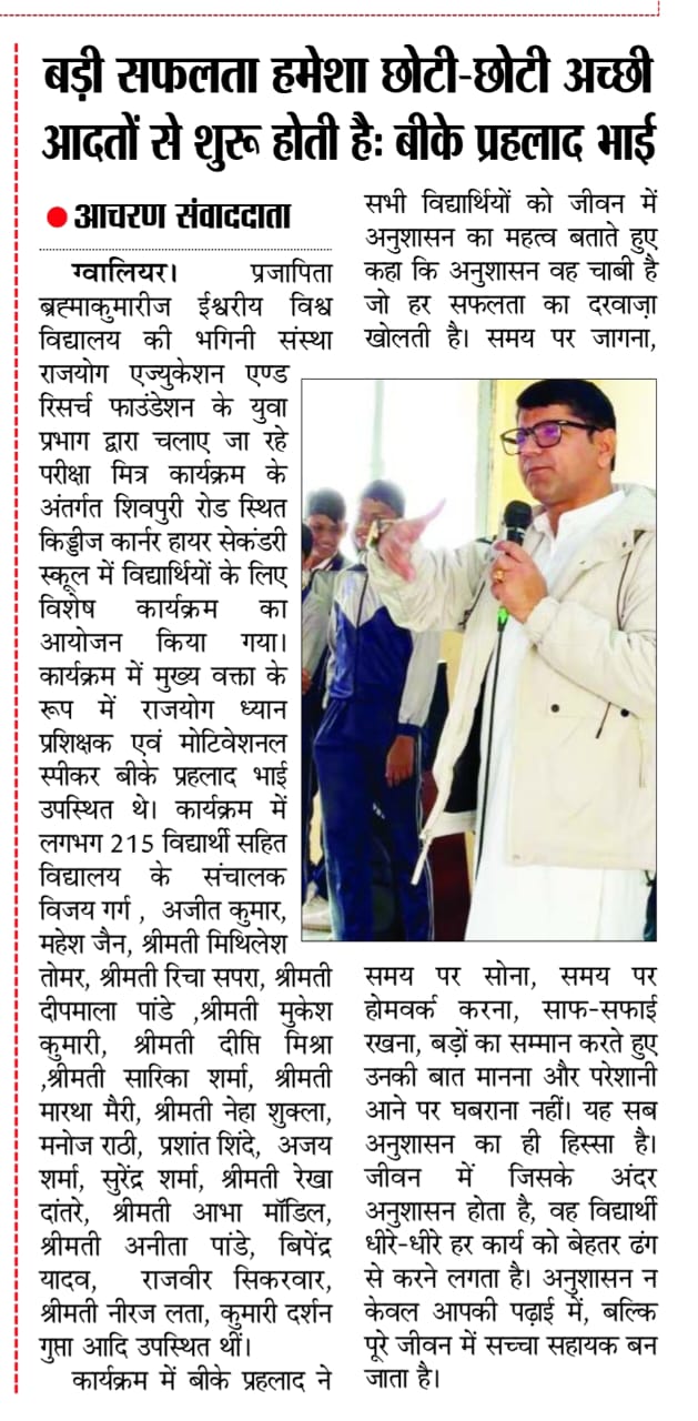 ग्वालियर। प्रजापिता ब्रह्माकुमारीज ईश्वरीय विश्व विद्यालय की भगिनी संस्था राजयोग एज्युकेशन एण्ड रिसर्च फाउंडेशन के युवा प्रभाग द्वारा चलाए जा रहे परीक्षा मित्र कार्यक्रम के अंतर्गत शिवपुरी रोड स्थित किड्डीज कार्नर हायर सेकंडरी स्कूल में विद्यार्थियों के लिए विशेष कार्यक्रम का आयोजन किया गया। कार्यक्रम में मुख्य वक्ता के रूप में राजयोग ध्यान प्रशिक्षक एवं मोटिवेशनल स्पीकर बीके प्रहलाद भाई उपस्थित थे।