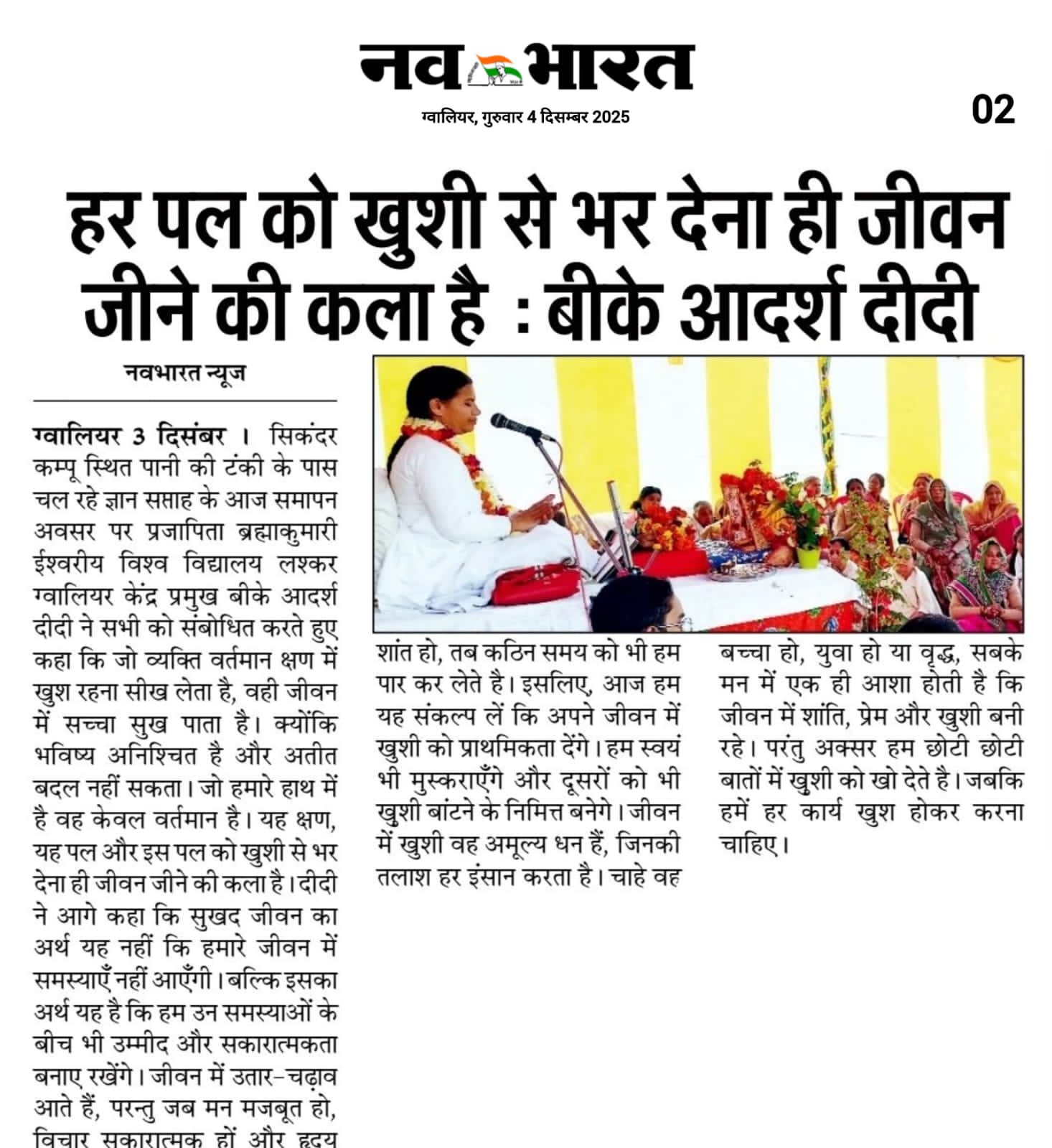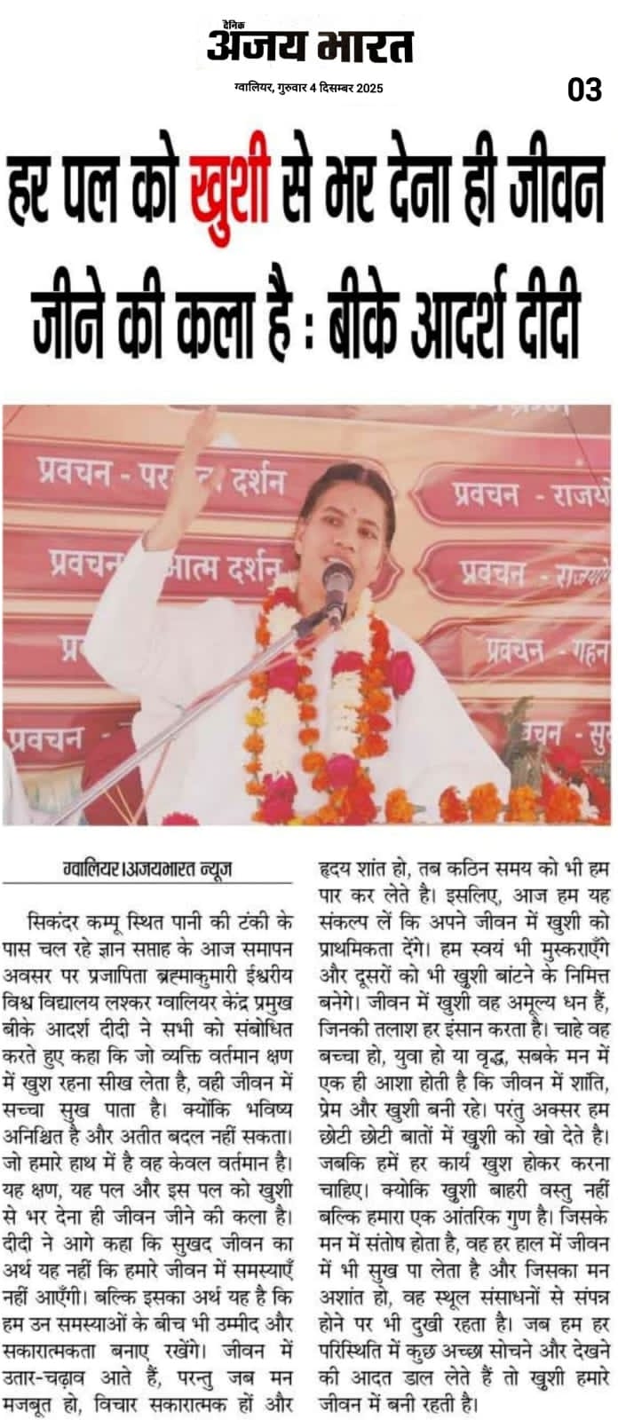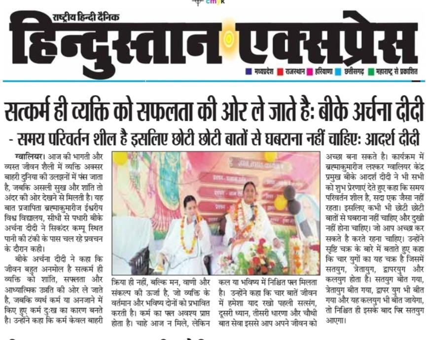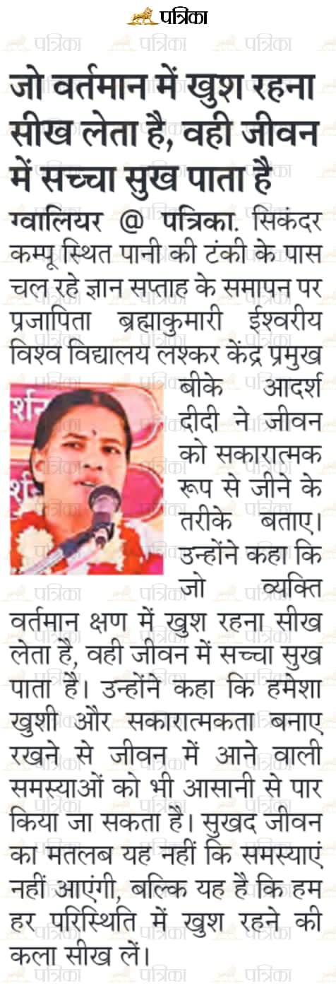 कार्यक्रम में ब्रह्माकुमारीज लश्कर ग्वालियर केंद्र प्रमुख बीके आदर्श दीदी नें भी सभी को शुभ प्रेरणाएं देते हुए कहा कि समय परिवर्तन शील है, सदा एक जैसा नहीं रहता। इसलिए कभी भी छोटी छोटी बातों से घबराना नहीं चाहिए और दुखी नहीं होना चाहिए। जो आप अच्छा कर सकते है करते रहना चाहिए जों आपको लग रह है, ठीक नहीं है आपसे नहीं हो रहा है, वह ईश्वर पर छोड़ दो तो सब अच्छा हो जायेगा।