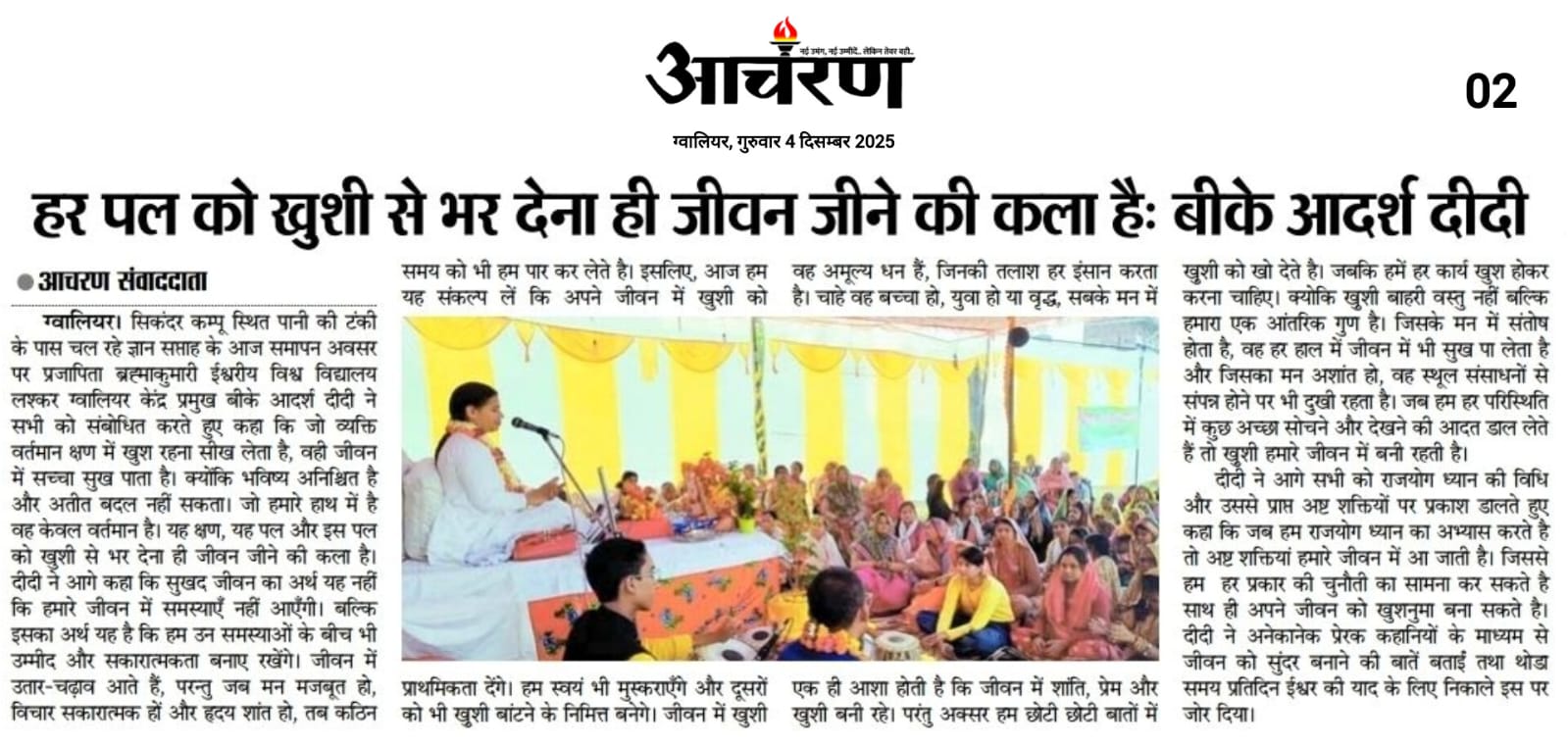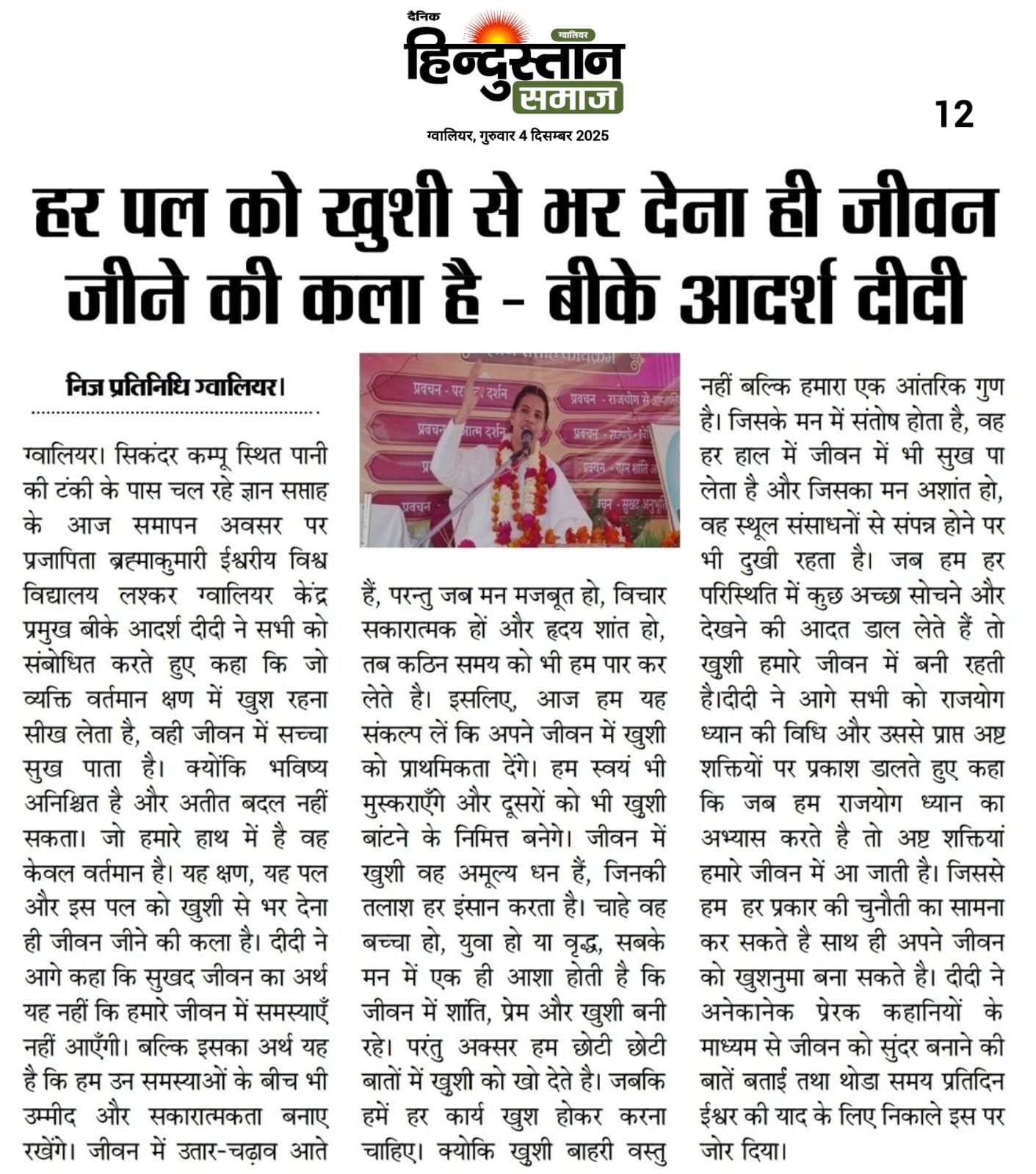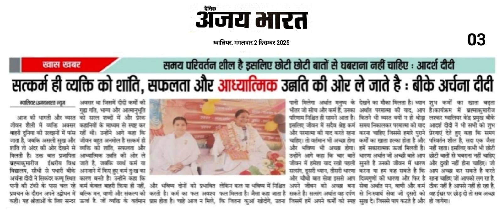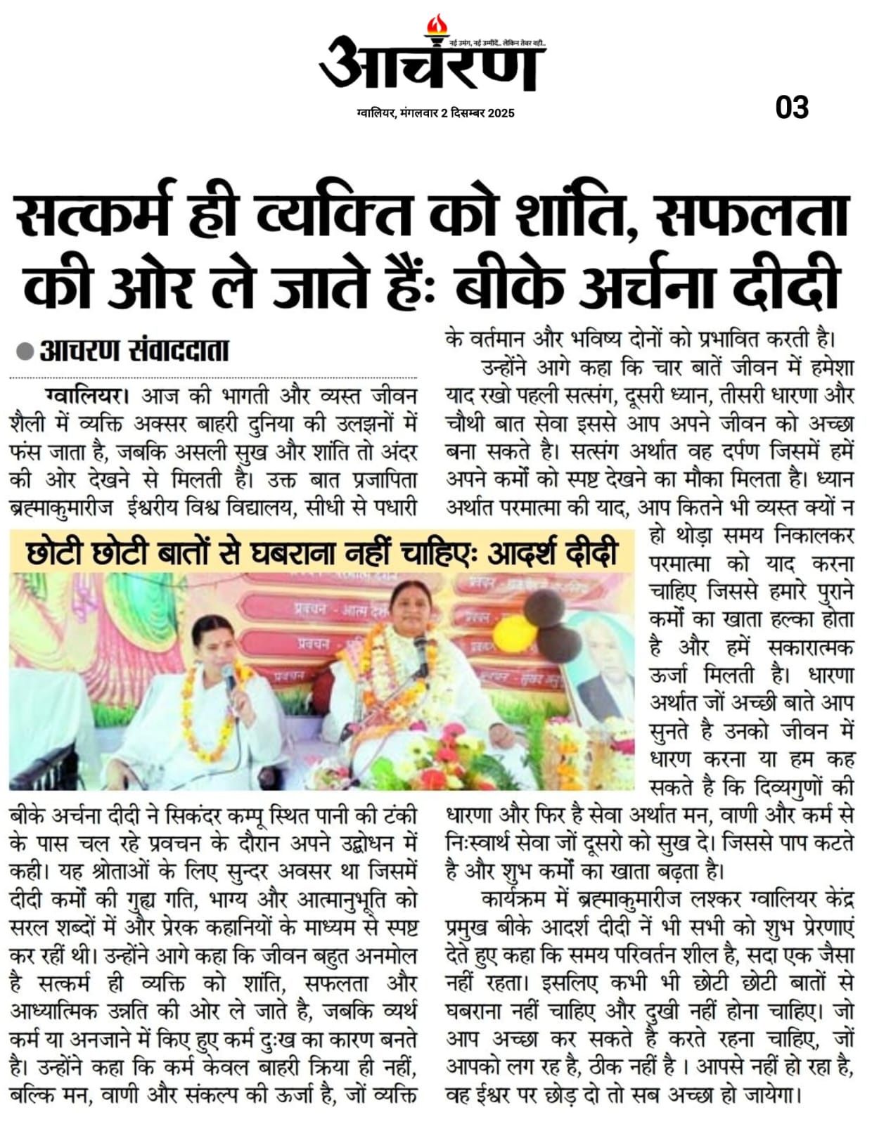 कार्यक्रम में ब्रह्माकुमारीज लश्कर ग्वालियर केंद्र प्रमुख बीके आदर्श दीदी नें भी सभी को शुभ प्रेरणाएं देते हुए कहा कि समय परिवर्तन शील है, सदा एक जैसा नहीं रहता। इसलिए कभी भी छोटी छोटी बातों से घबराना नहीं चाहिए और दुखी नहीं होना चाहिए। जो आप अच्छा कर सकते है करते रहना चाहिए जों आपको लग रह है, ठीक नहीं है आपसे नहीं हो रहा है, वह ईश्वर पर छोड़ दो तो सब अच्छा हो जायेगा।
