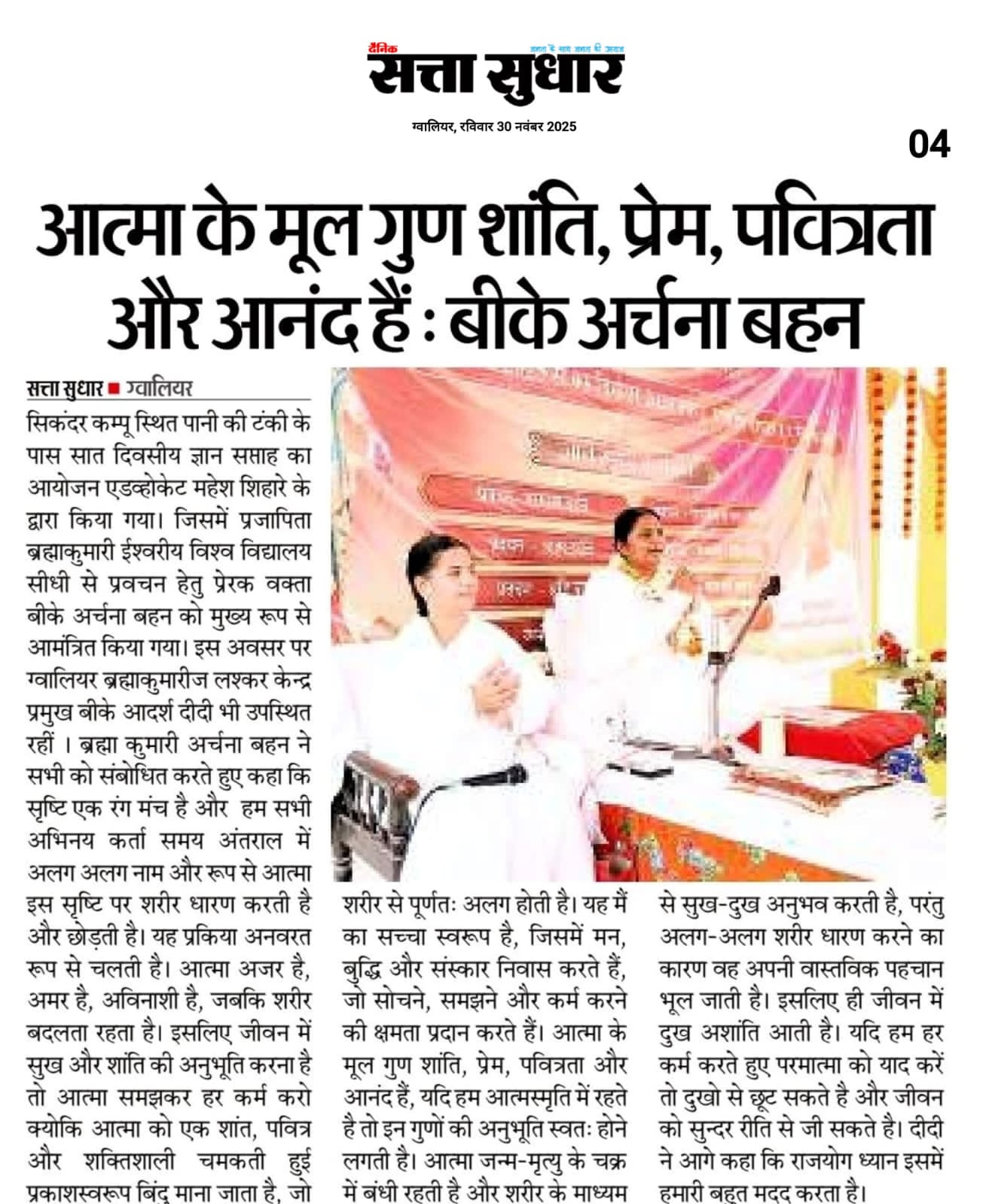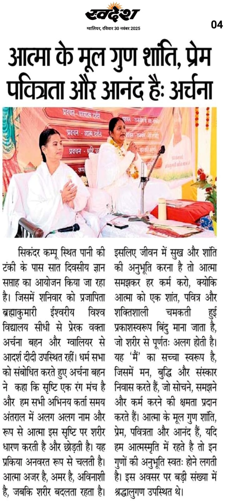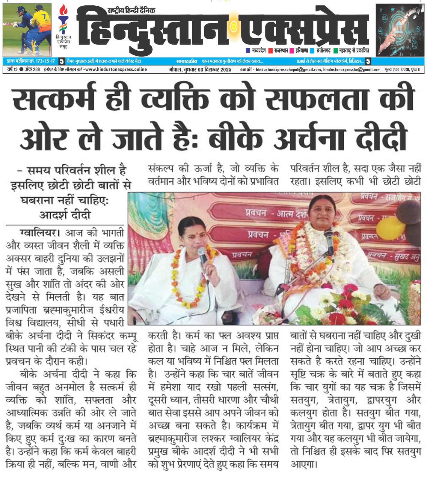 ग्वालियर। आज की भागती और व्यस्त जीवन शैली में व्यक्ति अक्सर बाहरी दुनिया की उलझनों में फंस जाता है, जबकि असली सुख और शांति तो अंदर की ओर देखने से मिलती है। उक्त बात प्रजापिता ब्रह्माकुमारीज ईश्वरीय विश्व विद्यालय, सीधी से पधारी बीके अर्चना दीदी ने सिकंदर कम्पू स्थित पानी की टंकी के पास चल रहे प्रवचन के दौरान अपने उद्बोधन में कही। यह श्रोताओं के लिए सुन्दर अवसर था जिसमें दीदी कर्मों की गुह्य गति, भाग्य और आत्मानुभूति को सरल शब्दों में और प्रेरक कहानियों के माध्यम से स्पष्ट कर रहीं थी। उन्होंने आगे कहा कि जीवन बहुत अनमोल है सत्कर्म ही व्यक्ति को शांति, सफलता और आध्यात्मिक उन्नति की ओर ले जाते है, जबकि व्यर्थ कर्म या अनजाने में किए हुए कर्म दुःख का कारण बनते है। उन्होंने कहा कि कर्म केवल बाहरी क्रिया ही नहीं, बल्कि मन, वाणी और संकल्प की ऊर्जा है, जों व्यक्ति के वर्तमान और भविष्य दोनों को प्रभावित करती है। कर्म का फल अवश्य प्राप्त होता है। चाहे आज न मिले, लेकिन कल या भविष्य में निश्चित फल मिलता है। जैसा कहा जाता है कि जितना कुआं खोदोगे, उतना पानी मिलेगा अर्थात मनुष्य के भीतर जो सोच और कर्म हैं, उनका परिणाम निश्चित ही सामने आता है। इसलिए जीवन में सदैव श्रेष्ठ कर्म और परमात्मा की याद करते रहना चाहिए। तो वर्तमान भी अच्छा होगा और भविष्य भी अच्छा होगा।