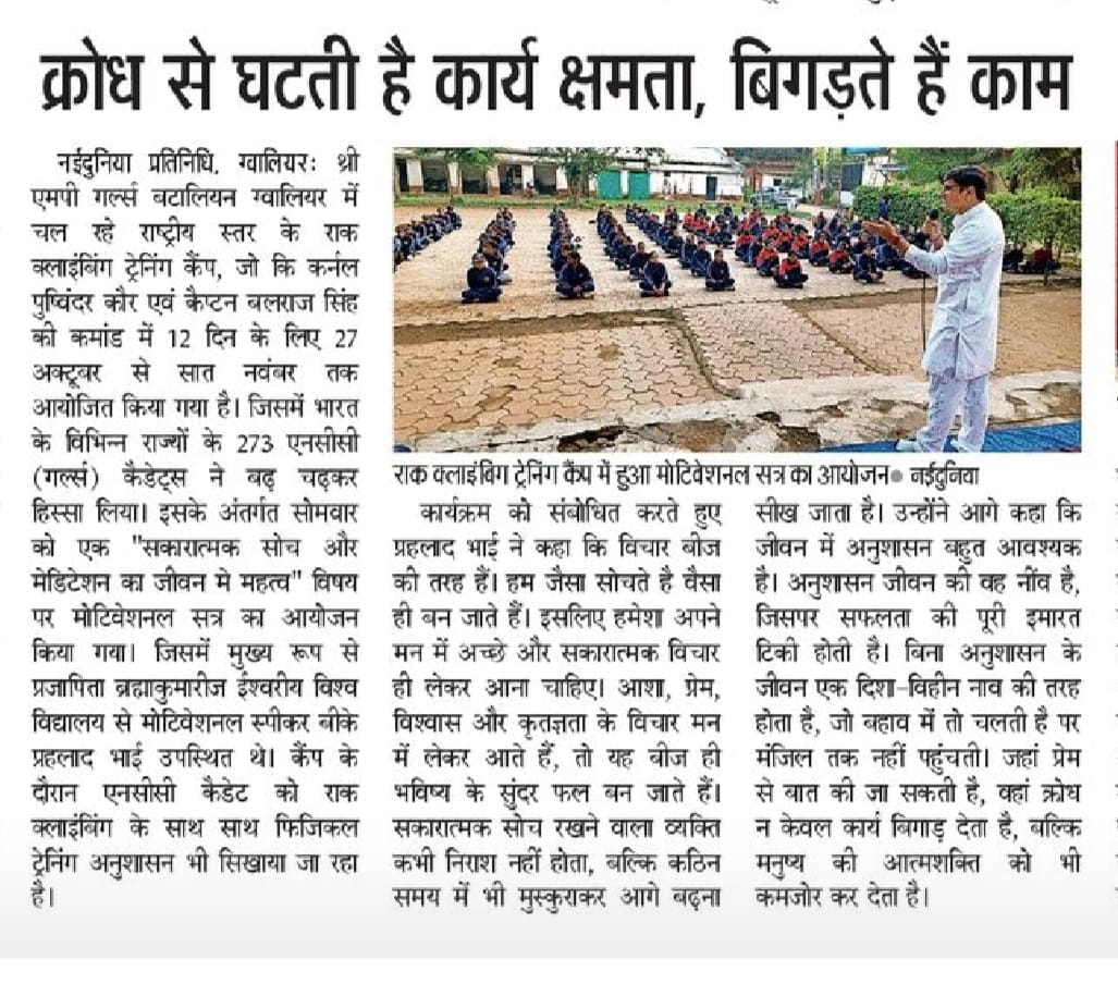 जिसमें भारत के विभिन्न राज्यों के 273 एन सी सी (गर्ल्स) कैडेटस ने बढ़ चढ़ कर हिस्सा लिया। इसीके अंतर्गत आज एक “सकारात्मक सोच और मेडिटेशन का जीवन मे महत्व” विषय पर मोटिवेशनल सत्र का आयोजन किया गया। जिसमें मुख्य रूप से प्रजापिता ब्रह्माकुमारीज ईश्वरीय विश्व विद्यालय से मोटिवेशनल स्पीकर एवं राजयोग ध्यान विशेषज्ञ बीके प्रहलाद भाई उपस्थित थे। इस कैम्प के दौरान एनसीसी कैडेट को रॉक क्लाइंबिंग के साथ साथ फिजिकल ट्रेनिंग अनुशासन भी सिखाया जा रहा है।
